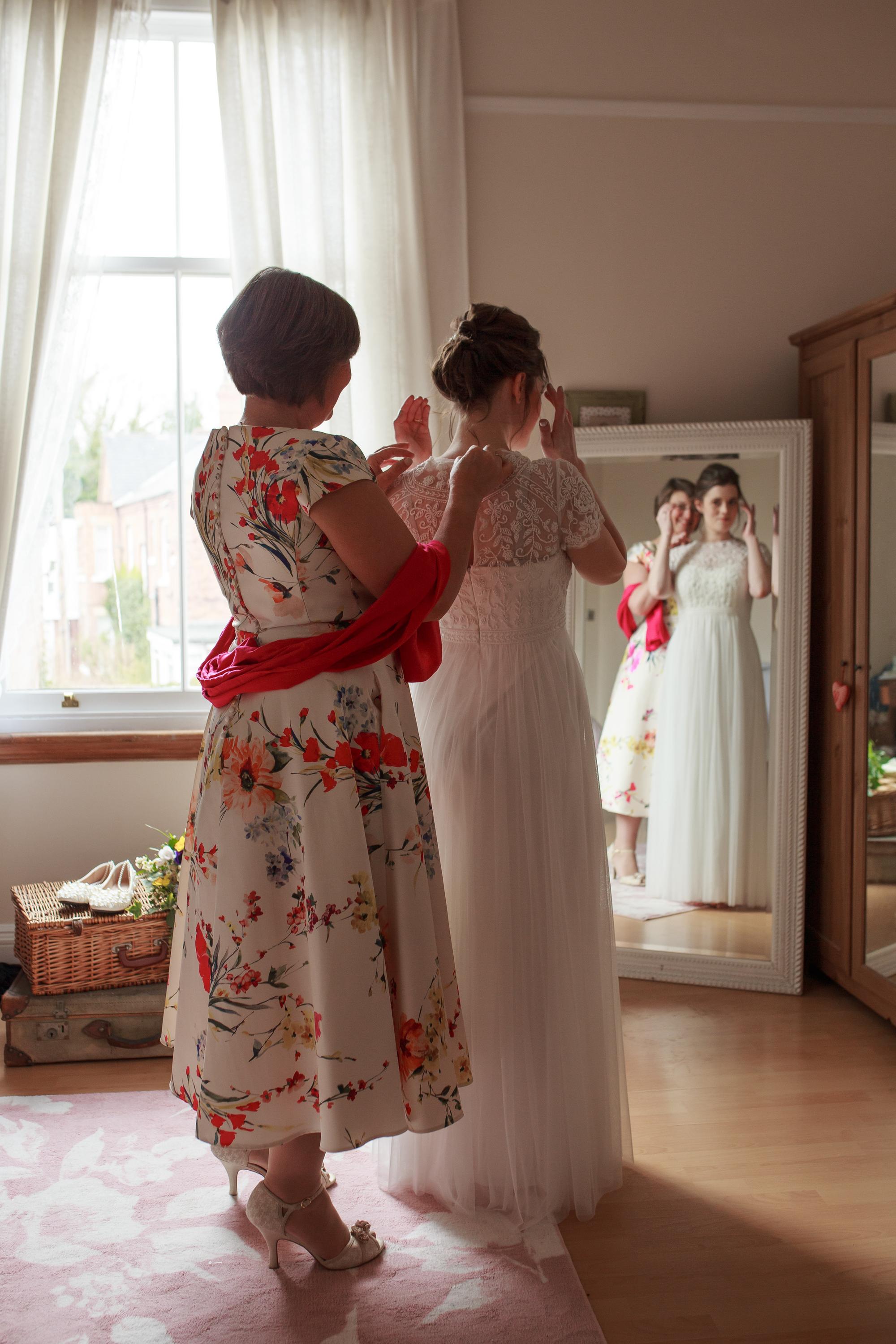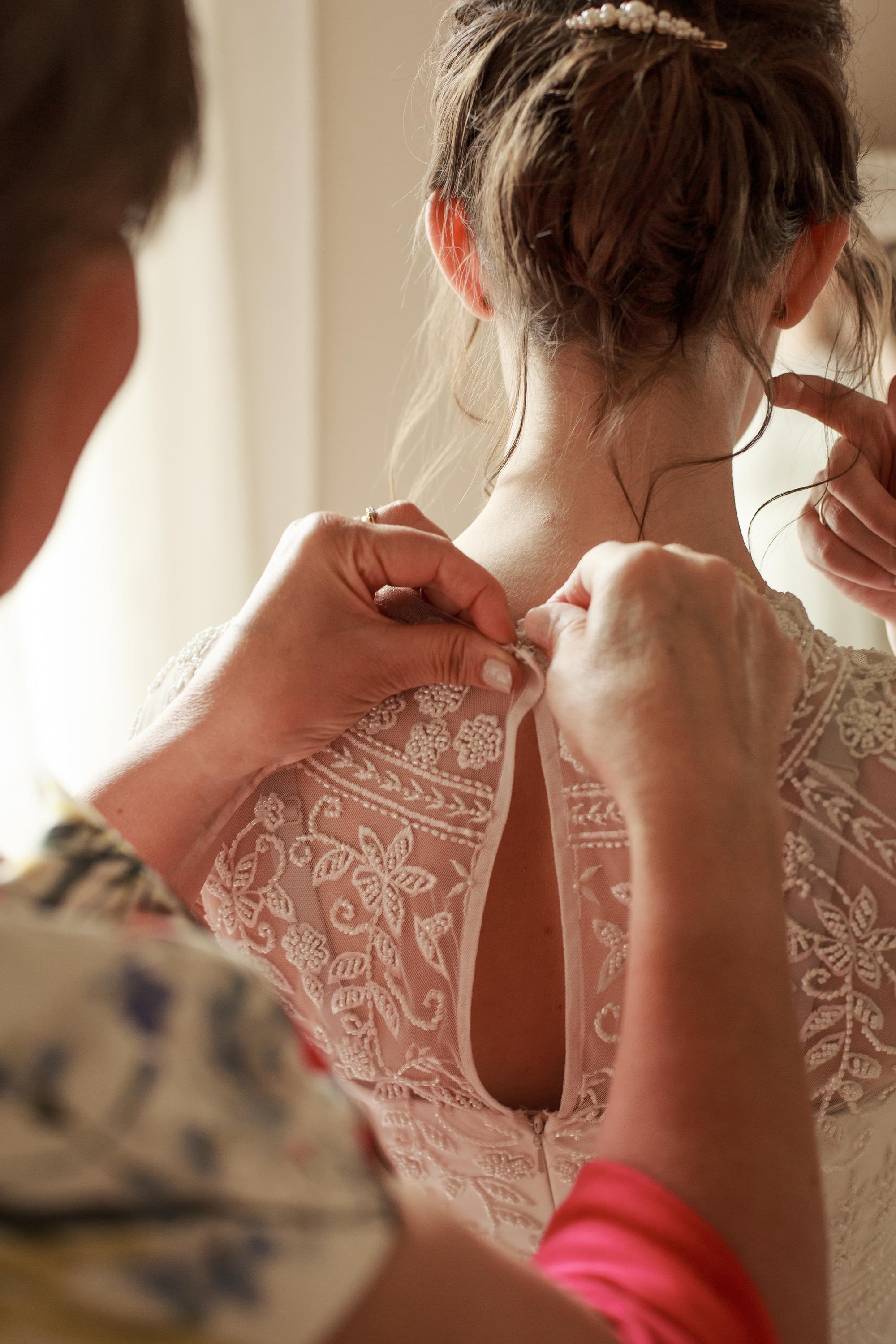Bride and mom on wedding day, Wedding day preparations, Mother helping bride with wedding preparations